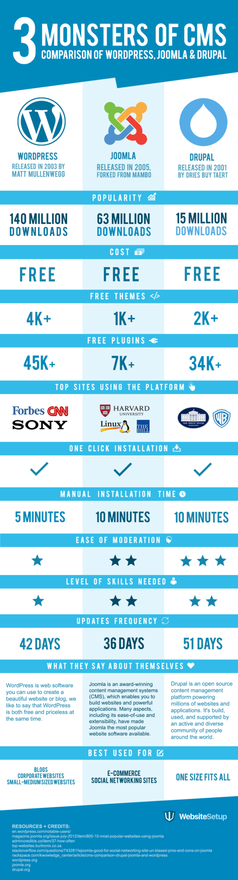 Regardless the number of systems available, WordPress happens to be the most sought after website building software in the world. In fact, it’s the backbone of over 60 million websites today, not to mention 40% of CMS-based websites use WordPress. A short infographic below is showing a basic comparison between the most popular CMS systems.