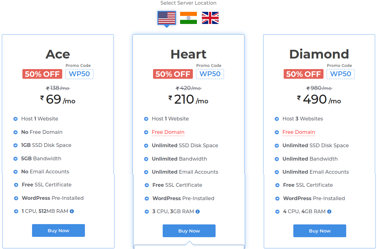 Their Ace is a starter plan and it costs you Rs.138 per month, Heart plan at Rs.420 per month and Diamond plan at Rs.980 per month. They currently offer a 50% discount on all these plans and to avail of this discount apply this coupon code: WP50.