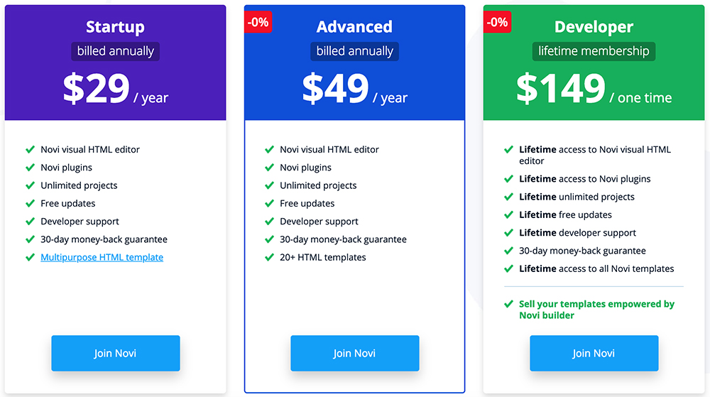The Startup and the Advanced plans literally equal to the price of a regular HTML template. And that is the price for an ANNUAL membership allowing you to use either 1 or 20+ templates from the NOVI collection. And by paying $149 for a Developer package only 1 single time, you’ll get a lifetime membership with everything necessary included FOR FREE.