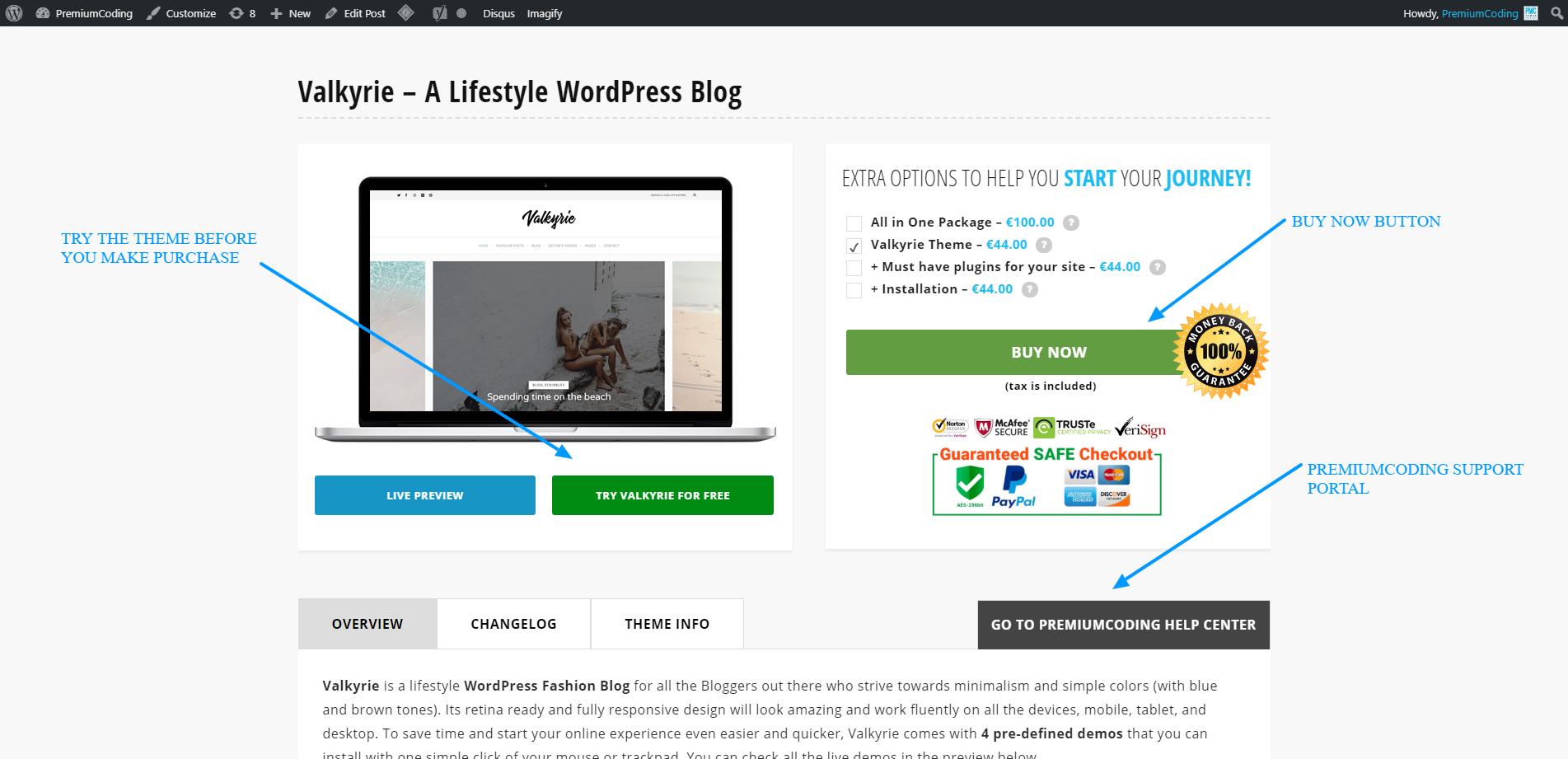 Let’s talk about one other feature that can help you decide if the theme is right for your needs. As you can see in the image you can try the theme before you make the purchase.