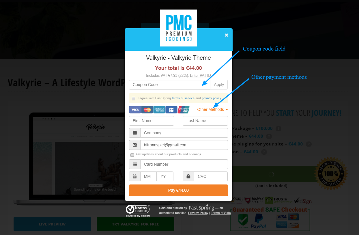 Now that you have decided which theme is right for you, click the buy now button. For security purposes, we use FastSpring as our payment provider, which is a USA based company with very strict security standards.