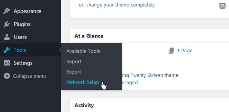 Now, go to your WordPress Dashboard and select the section called tools -> Network Setup. Once you filled out the required fields, go through the directions on the next page.