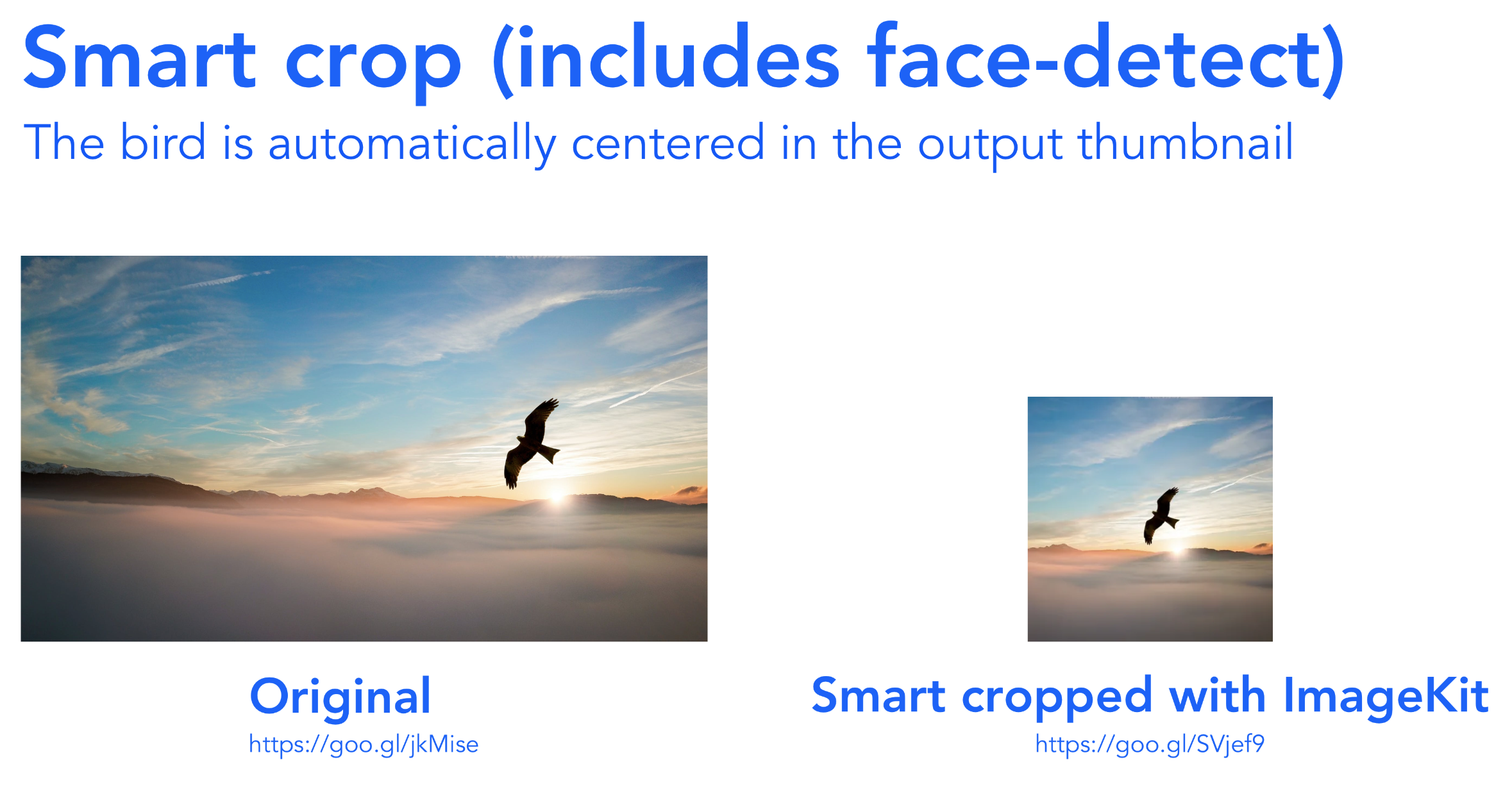 ImageKit also allows for real-time image transformations, directly from the image URL. We get features like image resize, crop (and smart crop), blur, rotate, image watermarking and many more, just by changing the image URL slightly.